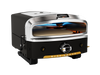 The Versa 16 Pizza Oven features a 16” Cordierite cooking stone that rotates 360°, ensuring even cooking and hands-free pizza making. Its patented dual burner system, with a U-shaped convection burner and an infrared burner under the stone, provides balanced heat for consistently cooked pizzas. The oven heats up to 950°F ambient and 750°F stone temperature in just 12 minutes, cooking pizzas up to 16” in 5 minutes or less. Fueled by propane, it is compatible with both 20lb LP gas tanks and 1lb canisters, with a natural gas conversion kit available separately. The hinged access lid offers easy maintenance and quick adjustments, while the motor is powered by either an AC adapter or 2 D batteries. Assembly required. Available exclusively at Airstream of Edmonton.